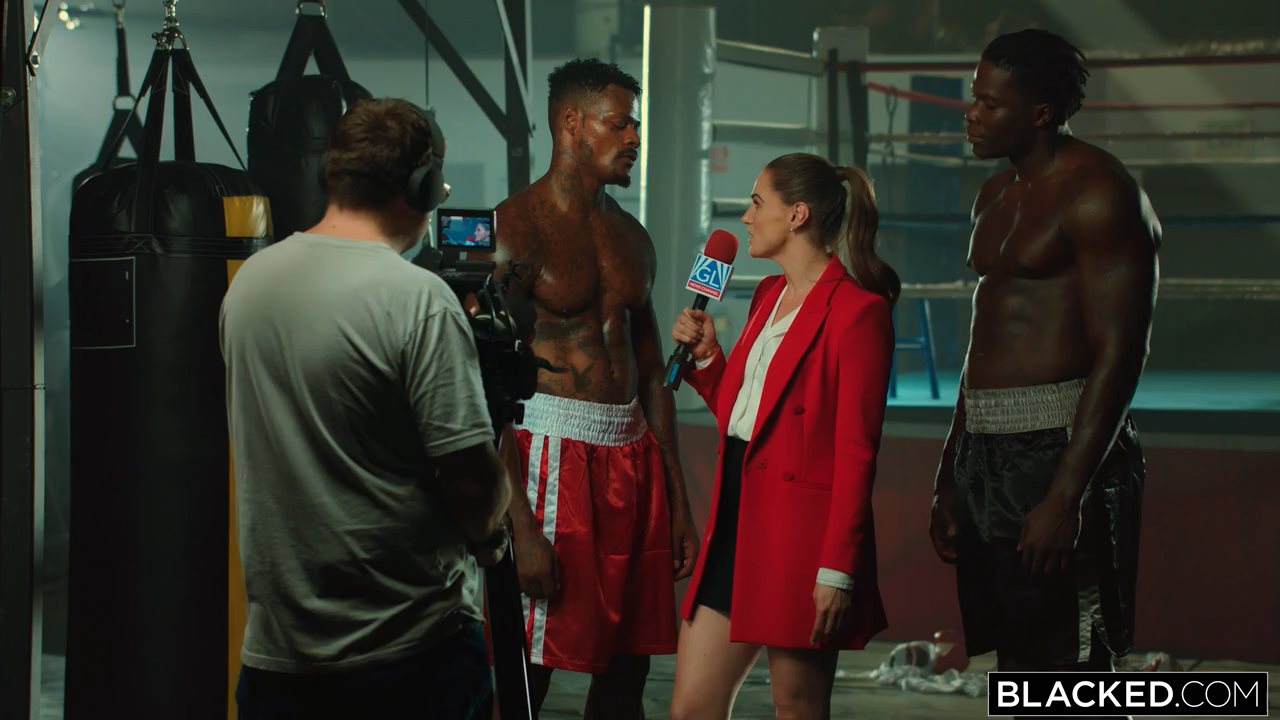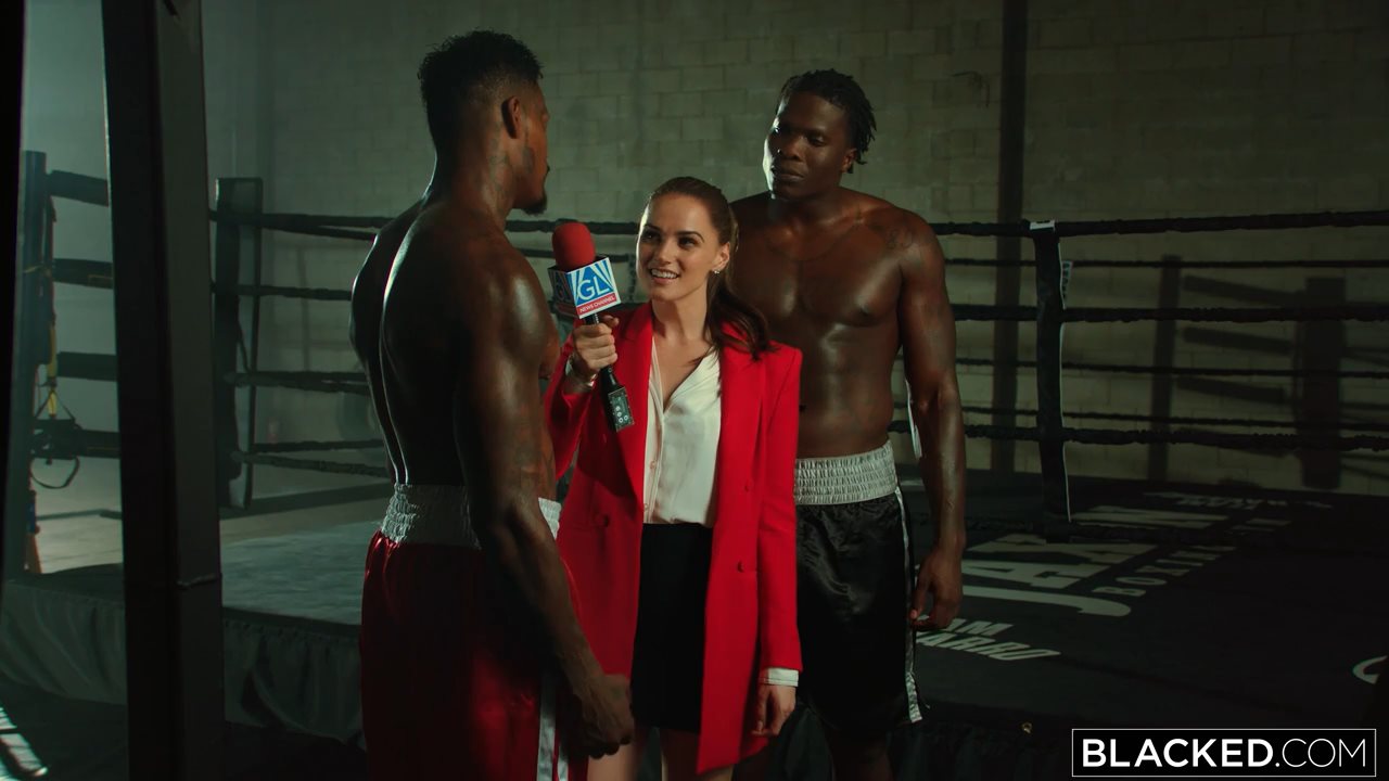 Сексапильная американская порнодива, Тори Блэк, временно стала подрабатывать журналисткой, поэтому пришла в спортзал, в котором тренировались двое темнокожих боксеров, и попросила у ребят дать ей интервью. Мускулистые негры сразу возбудились при виде милой цыпочки и, расчехлив длинные члены, заставили ее сделать минет. Стройная нимфа старательно отсосала бойцам хуи и вошла в экстаз, после чего стала раком и приняла болт одного из африканцев в тугую пизденку по самые яйца, второй мавр в это время все также совал эрегированный писюн в глотку кокетки. Позже атлеты поменялись местами и поимели деваху до оргазма.
