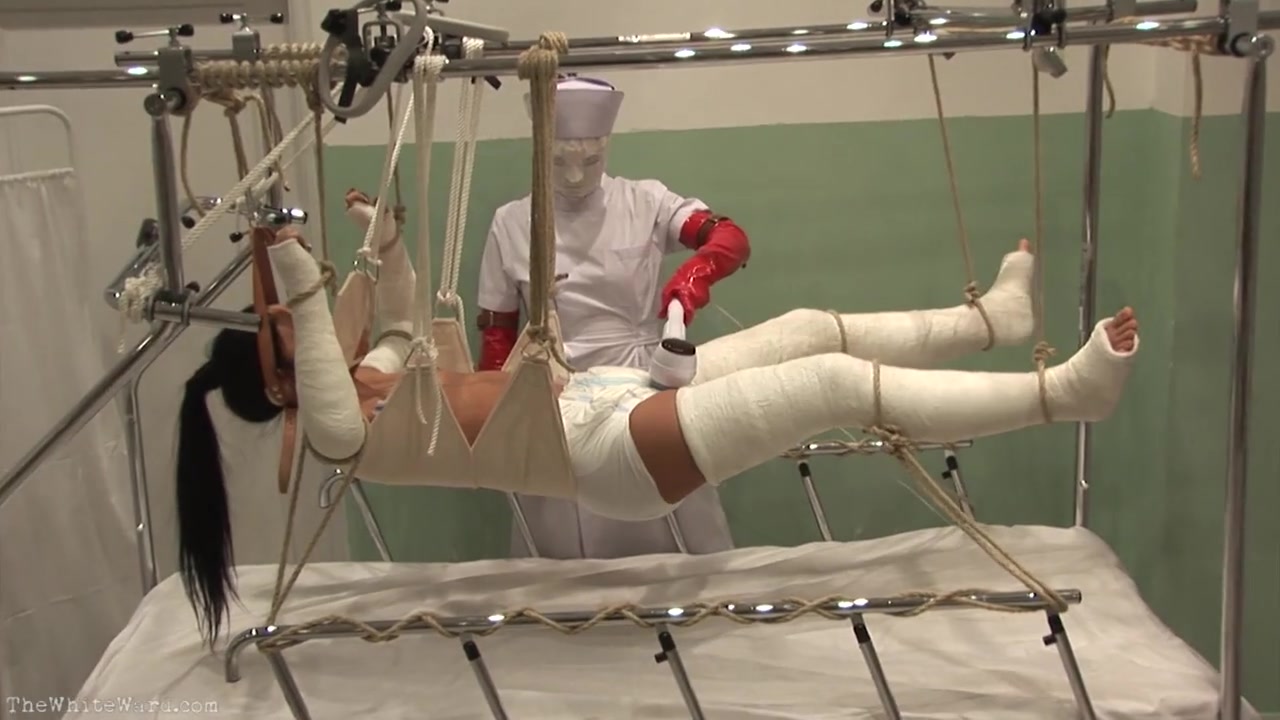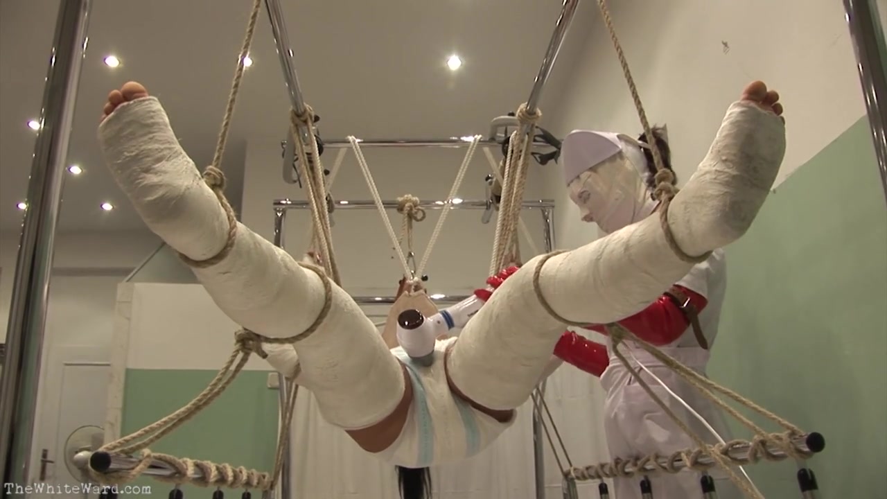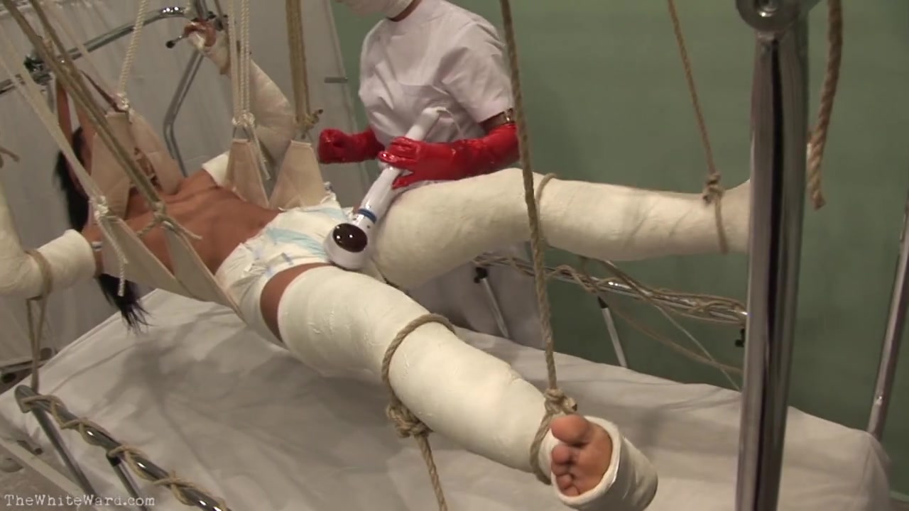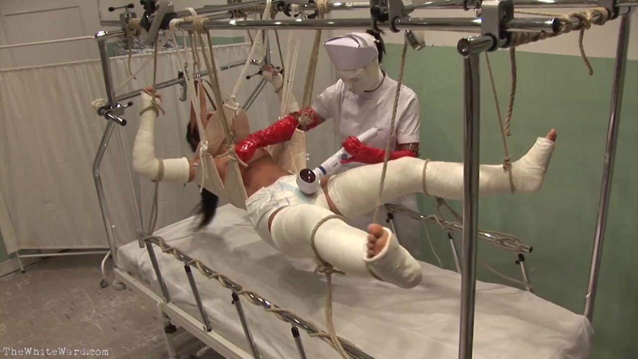 Связанная по рукам и ногам вся в бинтах азиатка в подвешенном состоянии висит на веревках над своей койкой в садо мазо больнице хирургического отделения. Молодая медсестричка в маске подходит к обездвиженному телу и начинает сквозь памперсы ласкать киску девушки с помощью вибратора. Это начинает заводить девушку и легкие стоны со временем превращаются в крики от умопомрачительного возбуждения. Машинная мастурбация сделала свое дело и больная поучила мощный конвульсивный клиторальный оргазм соизмерим с высшей степенью наслаждения от подобного действия. Смотрим это нестандартное видео онлайн и комментируем!